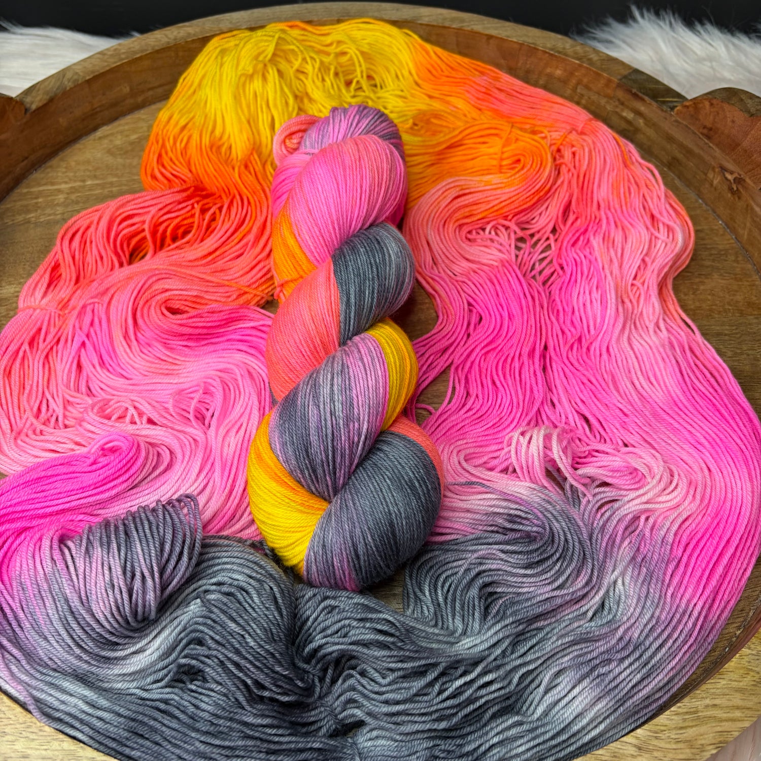 Hand dyed with professional acid dyes. I wash all yarns after dyeing, but it may bleed little on the first wash. Each hank is unique if using more then one its best to alternate hanks every few rows.