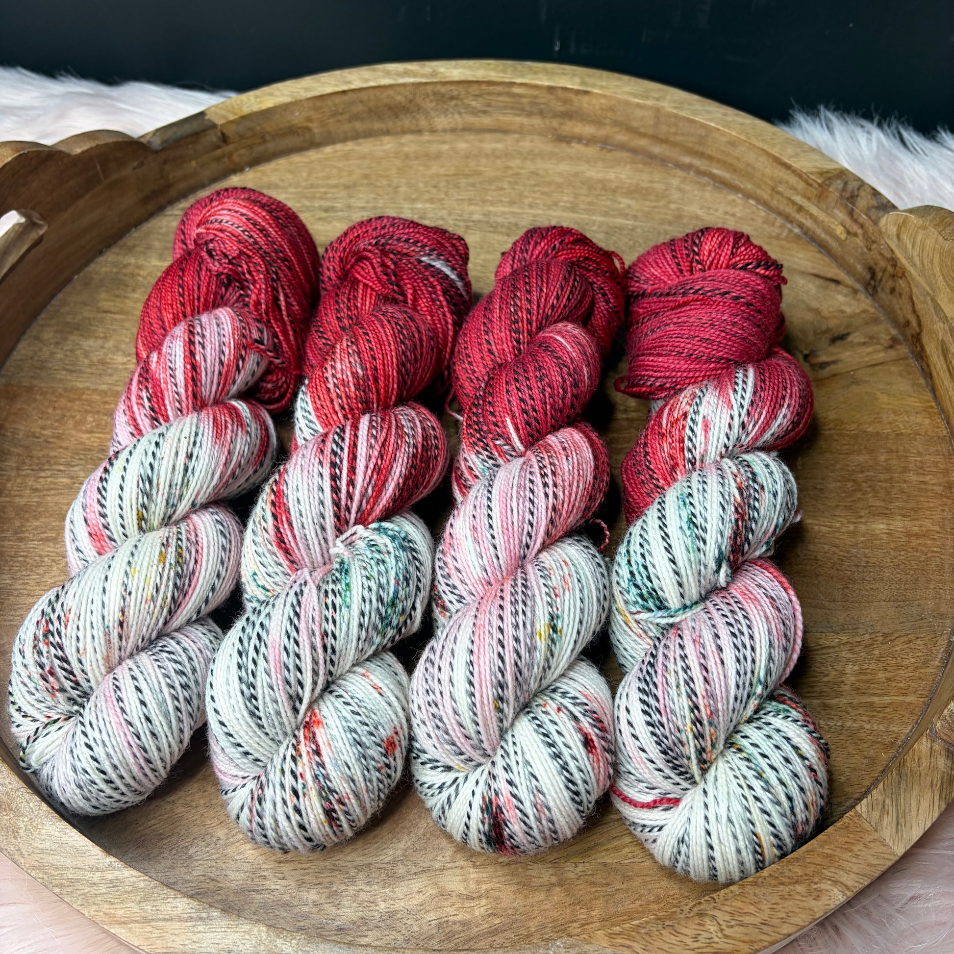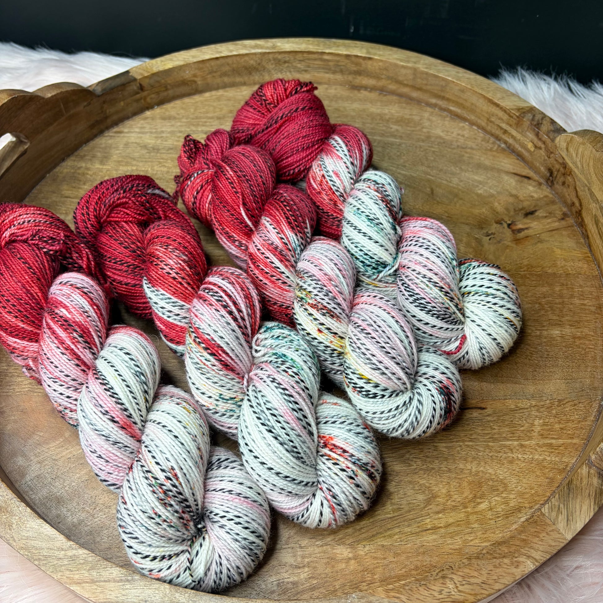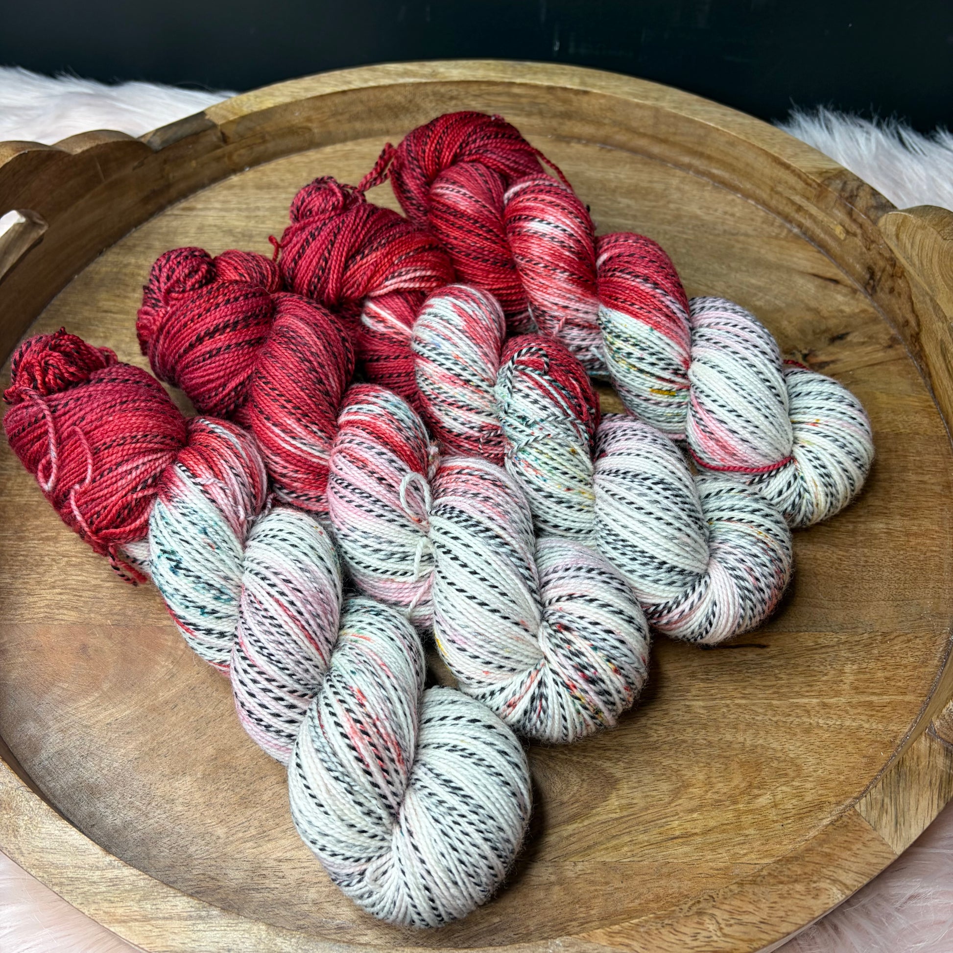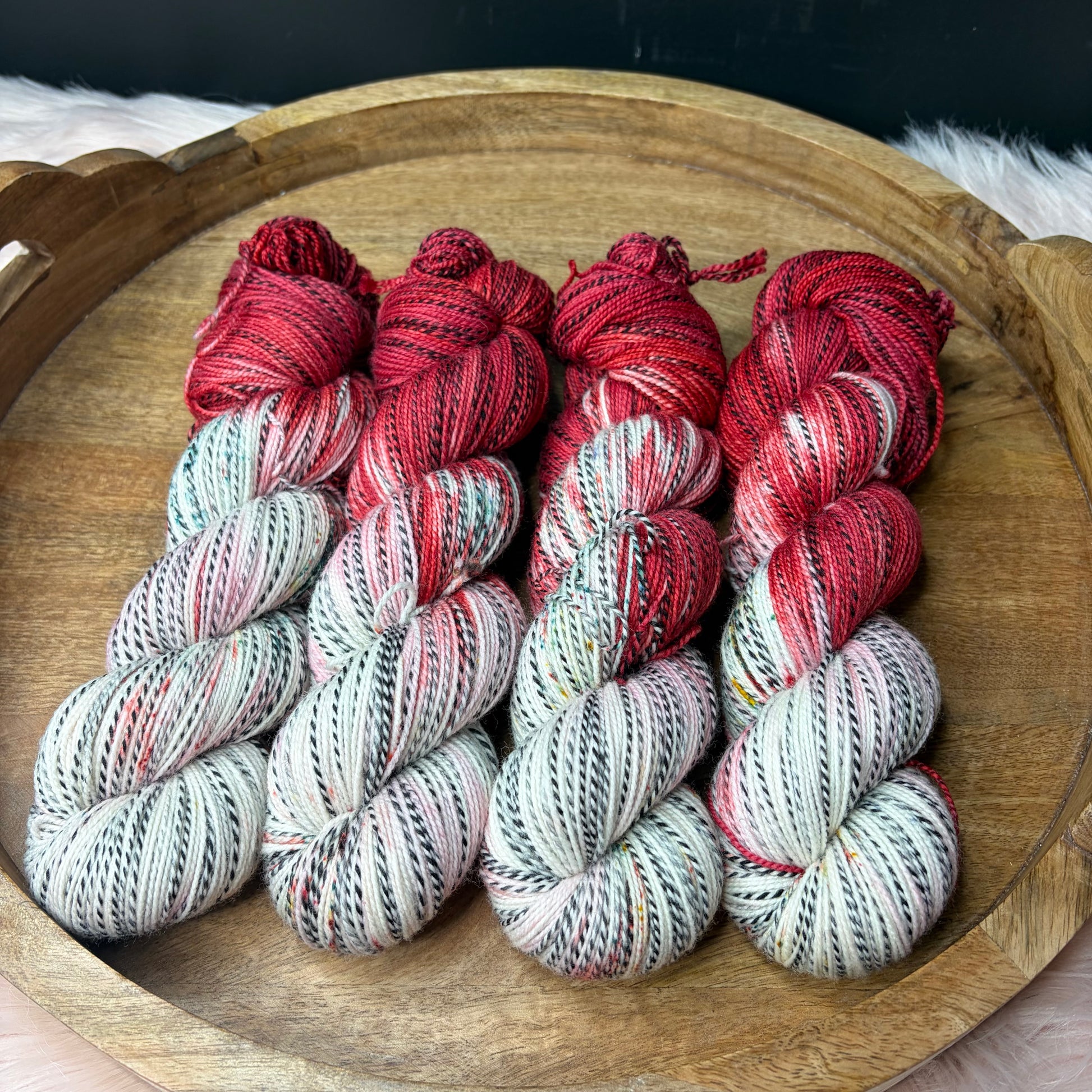 Caroline Fingering: This base was named after the amazing Caroline Herrera. This base will create an amazing zebra like look with random stripes of black. It is a super soft and squishy yarn with the tight twist and nylon it's the perfect yarn for any project from socks to hats and everything in between.