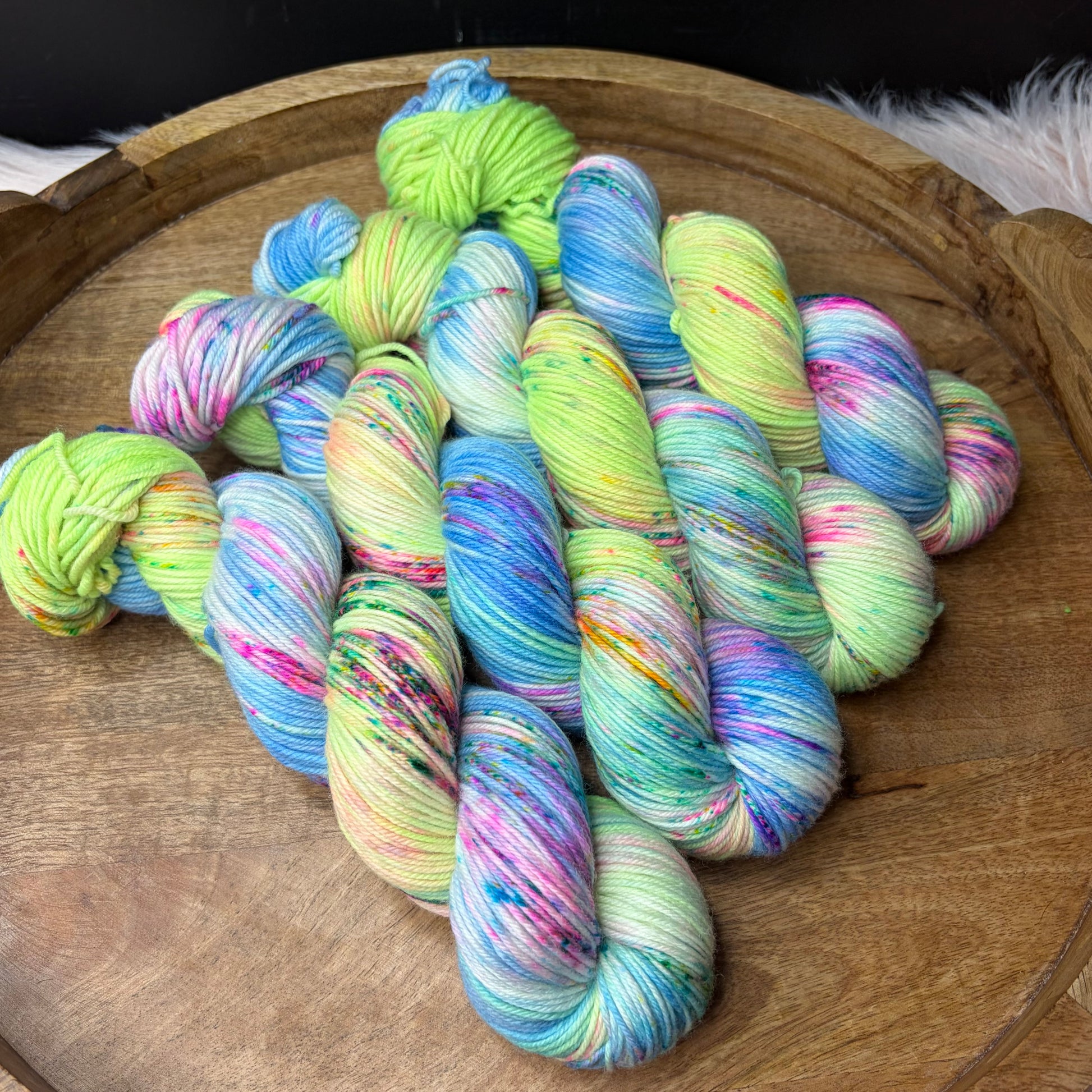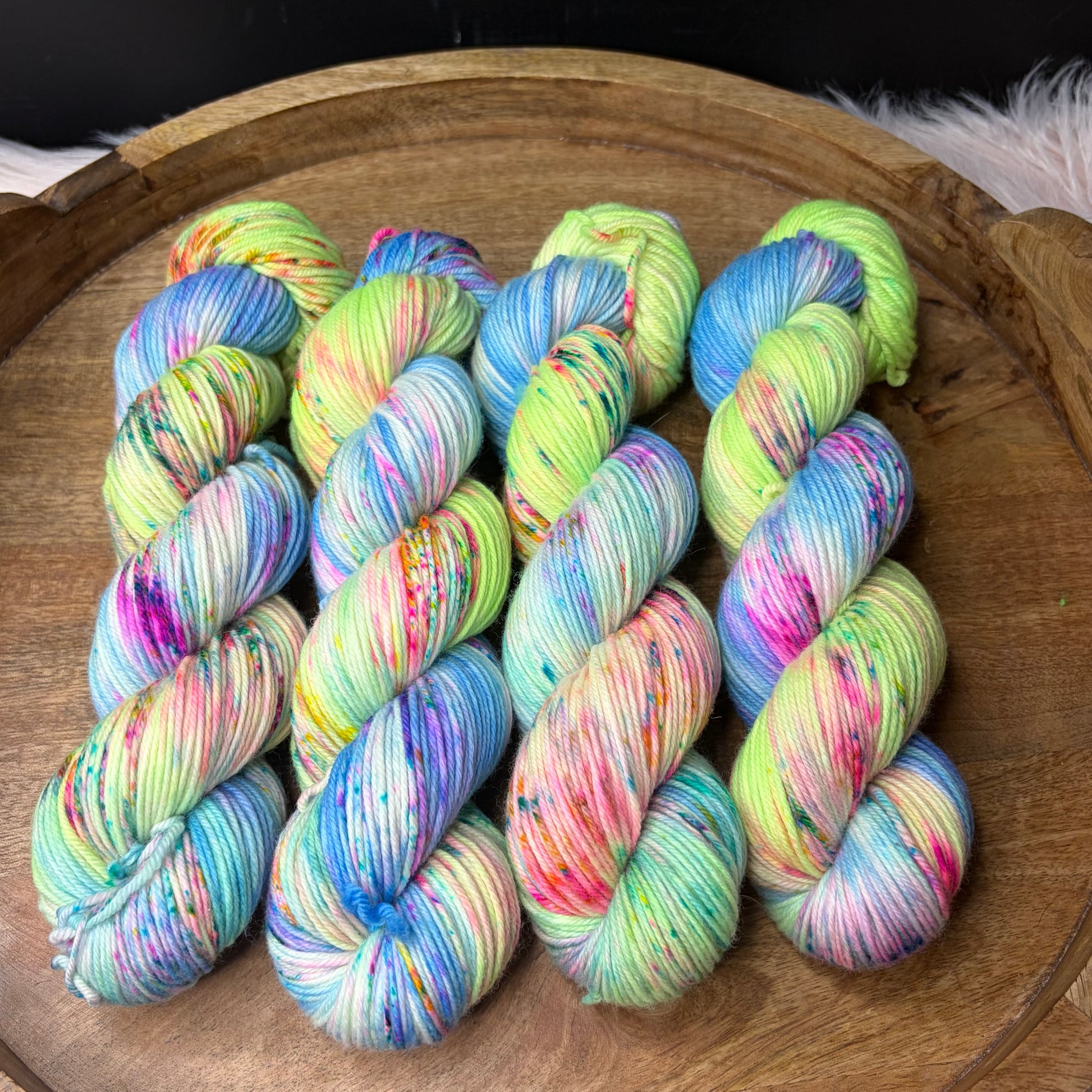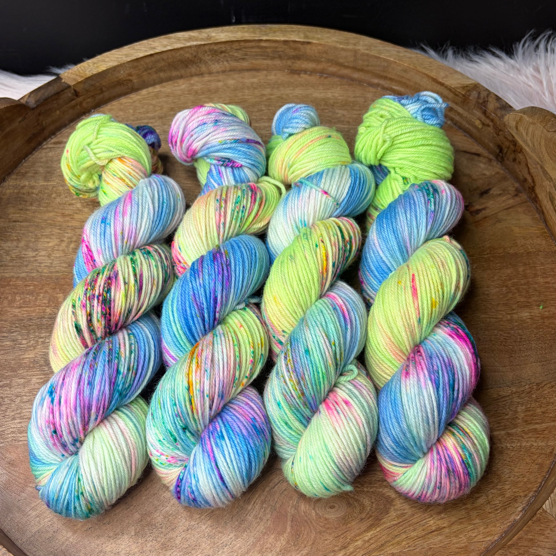 Trevor Morgan DK: Named after Rachel Trevor Morgan who is famous for making hats for Queen Elizabeth. This is my absolute favorite base. I use it for EVERYTHING, socks, shawls, hats, cowls, sweaters you name it. It has a 4 ply construction and is round, bouncing and smooth and has great stitch definition.