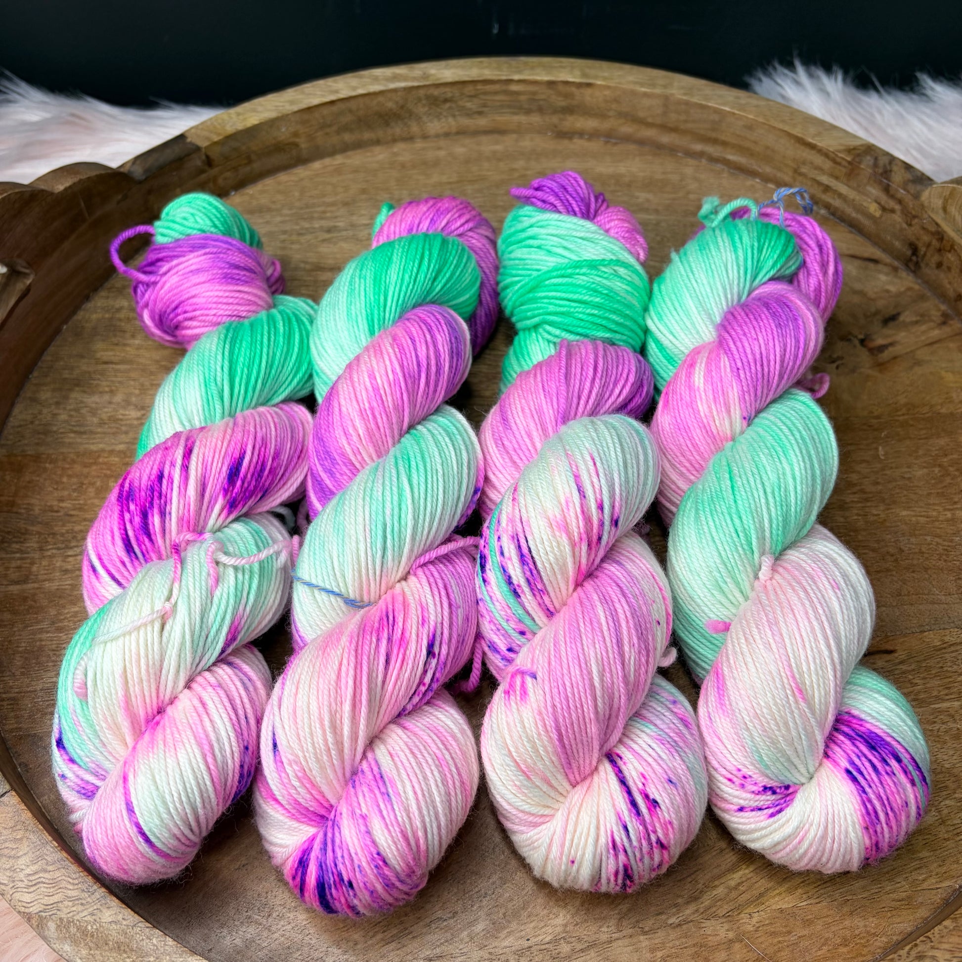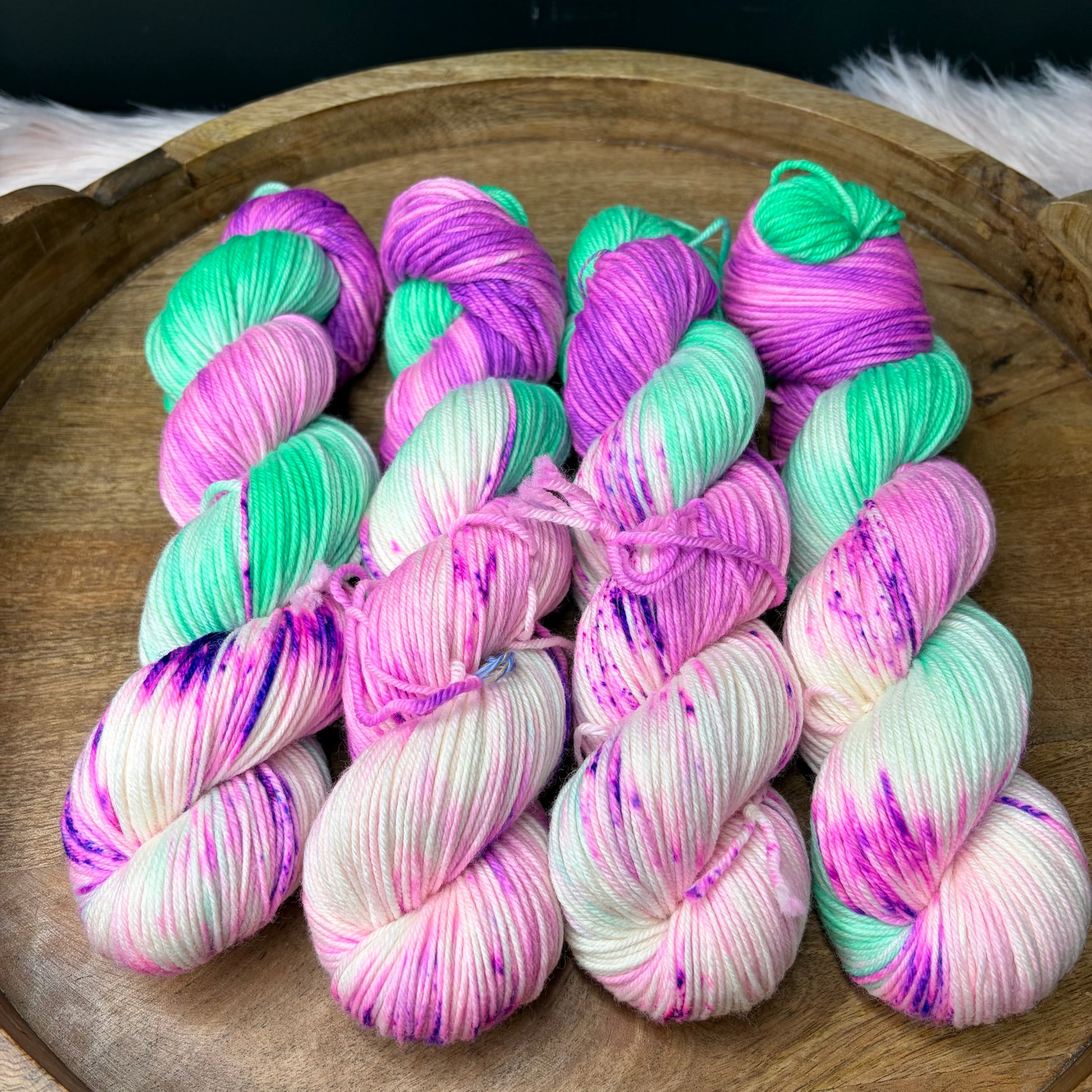 Trevor Morgan DK: Named after Rachel Trevor Morgan who is famous for making hats for Queen Elizabeth. This is my absolute favorite base. I use it for EVERYTHING, socks, shawls, hats, cowls, sweaters you name it. It has a 4 ply construction and is round, bouncing and smooth and has great stitch definition.