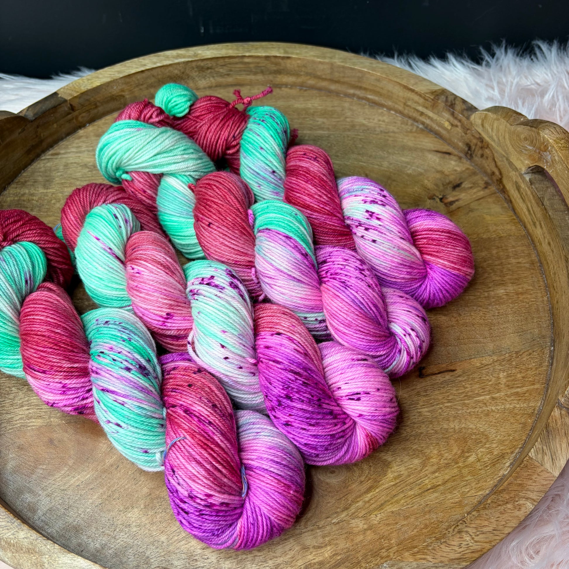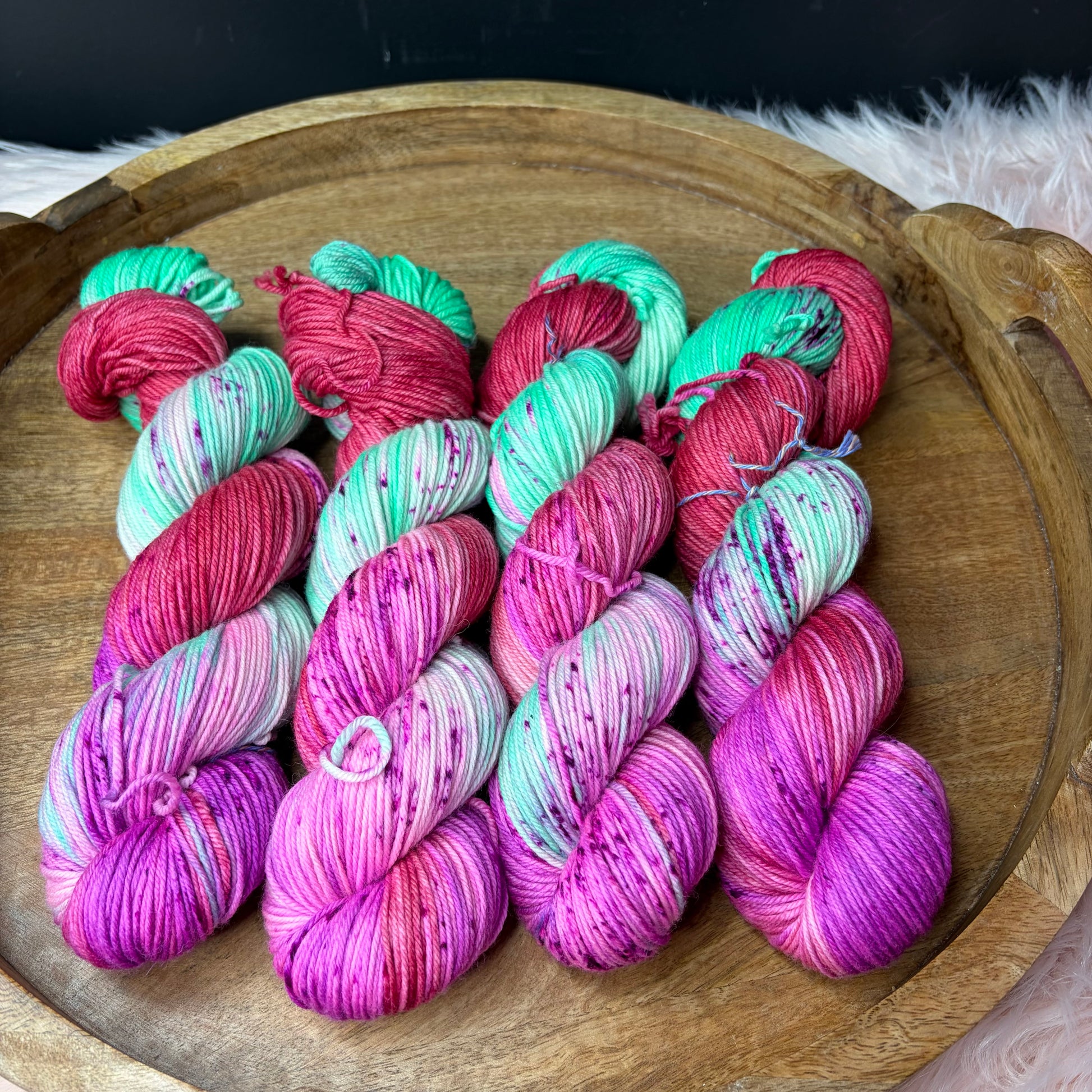 Trevor Morgan DK: Named after Rachel Trevor Morgan who is famous for making hats for Queen Elizabeth. This is my absolute favorite base. I use it for EVERYTHING, socks, shawls, hats, cowls, sweaters you name it. It has a 4 ply construction and is round, bouncing and smooth and has great stitch definition.