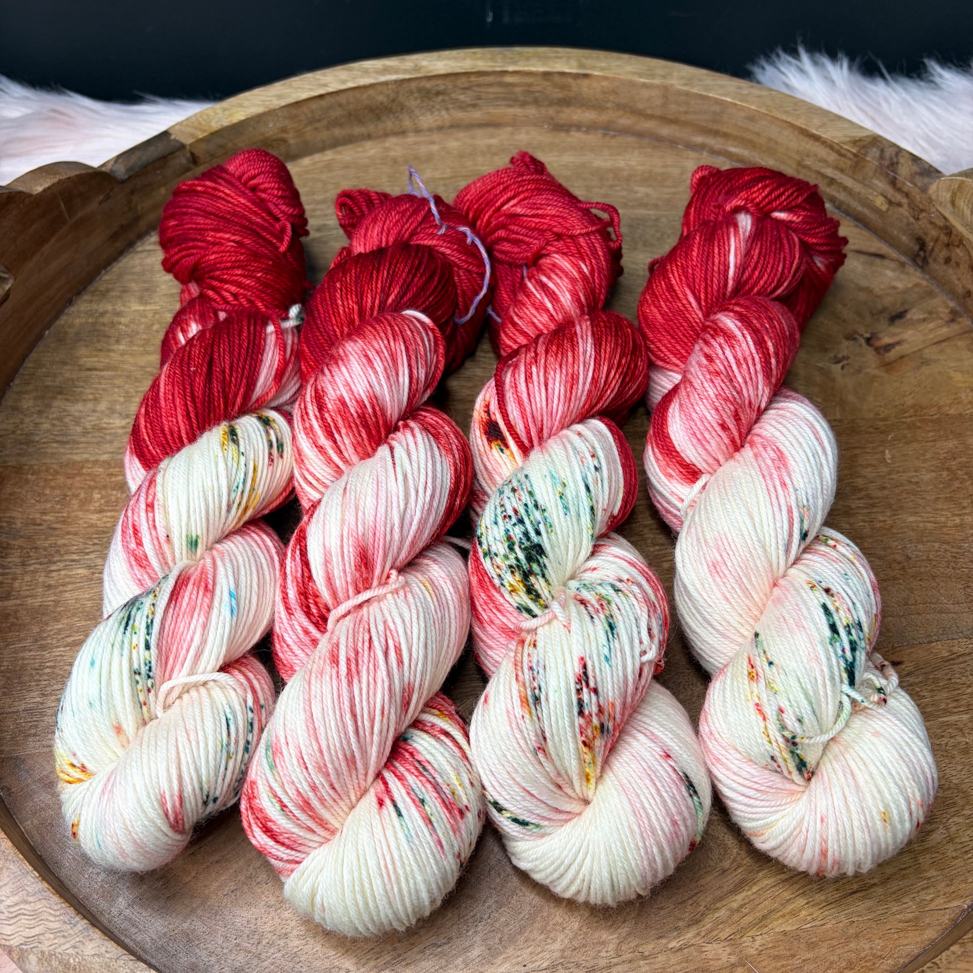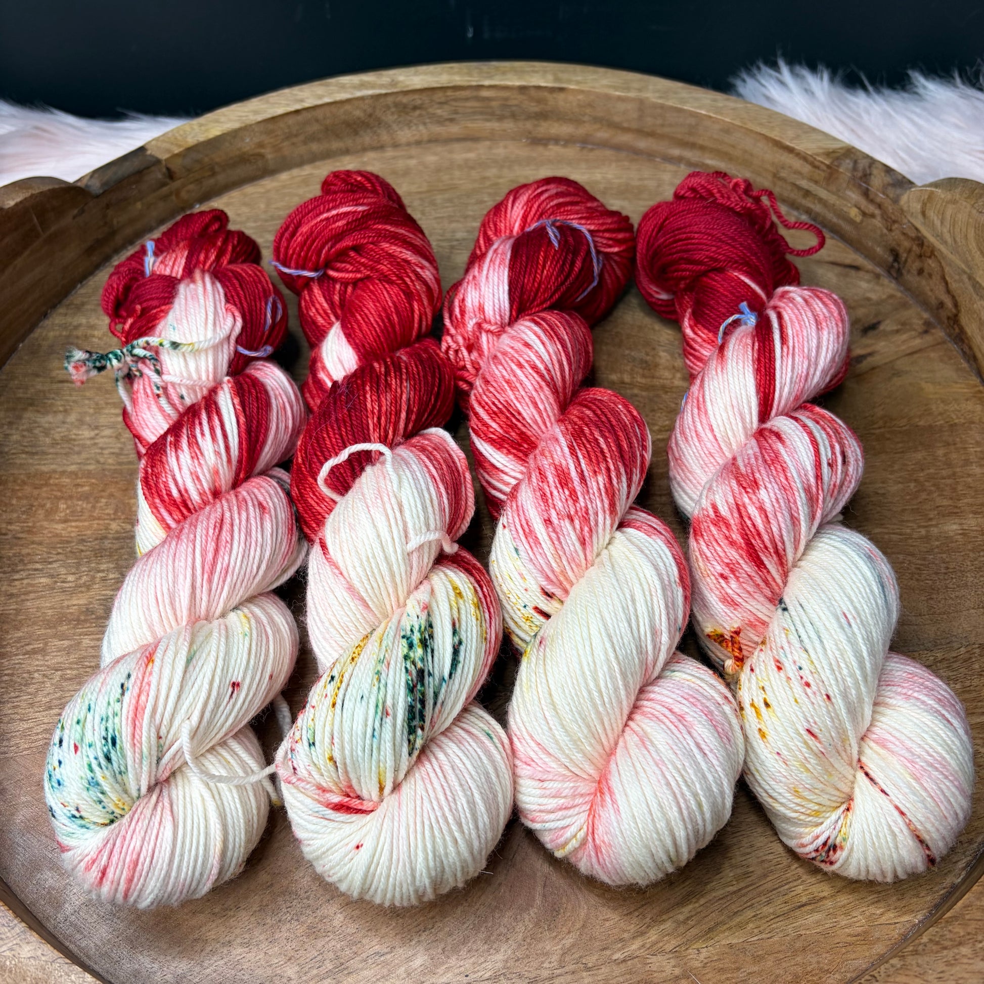 Trevor Morgan DK: Named after Rachel Trevor Morgan who is famous for making hats for Queen Elizabeth. This is my absolute favorite base. I use it for EVERYTHING, socks, shawls, hats, cowls, sweaters you name it. It has a 4 ply construction and is round, bouncing and smooth and has great stitch definition.