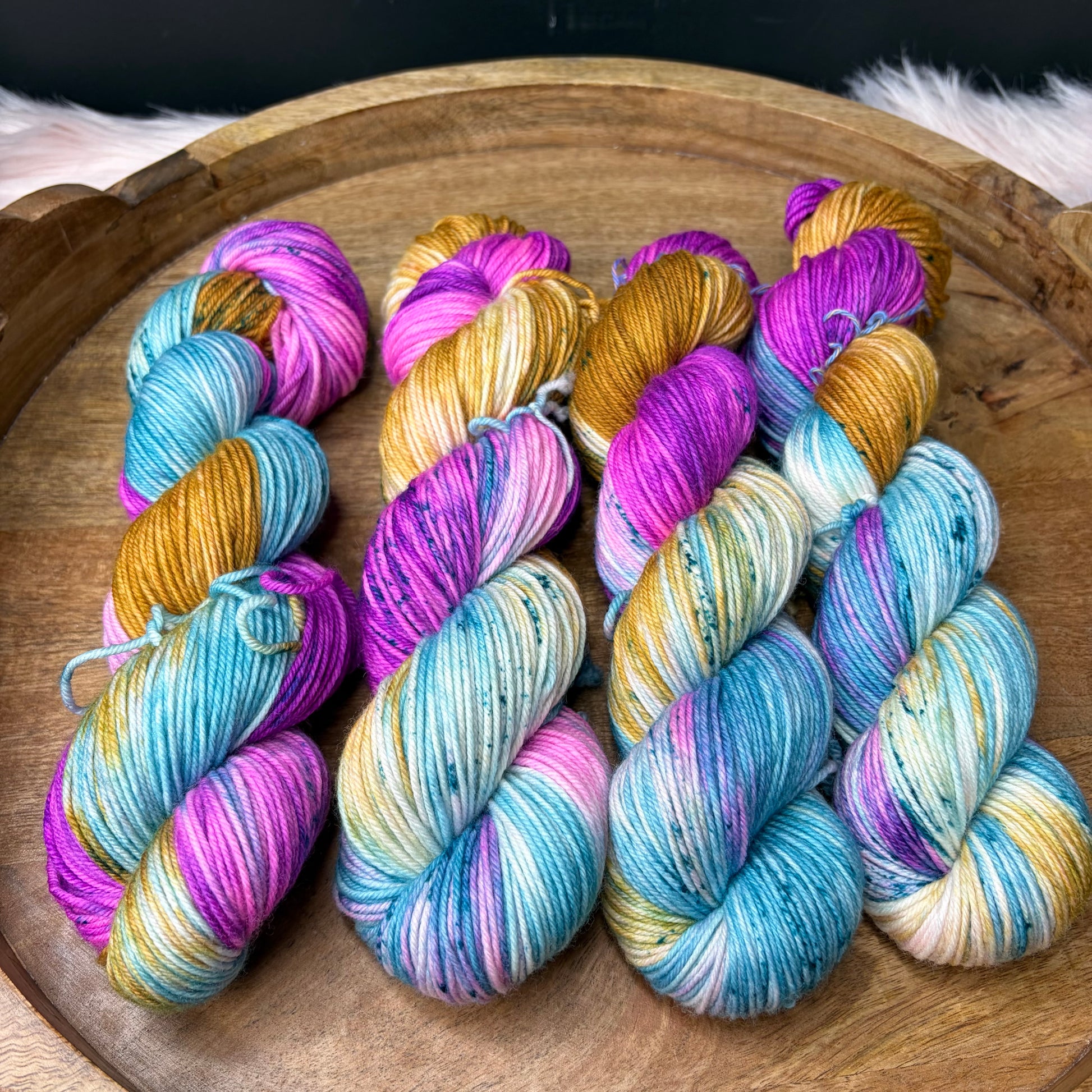 Trevor Morgan DK: Named after Rachel Trevor Morgan who is famous for making hats for Queen Elizabeth. This is my absolute favorite base. I use it for EVERYTHING, socks, shawls, hats, cowls, sweaters you name it. It has a 4 ply construction and is round, bouncing and smooth and has great stitch definition.