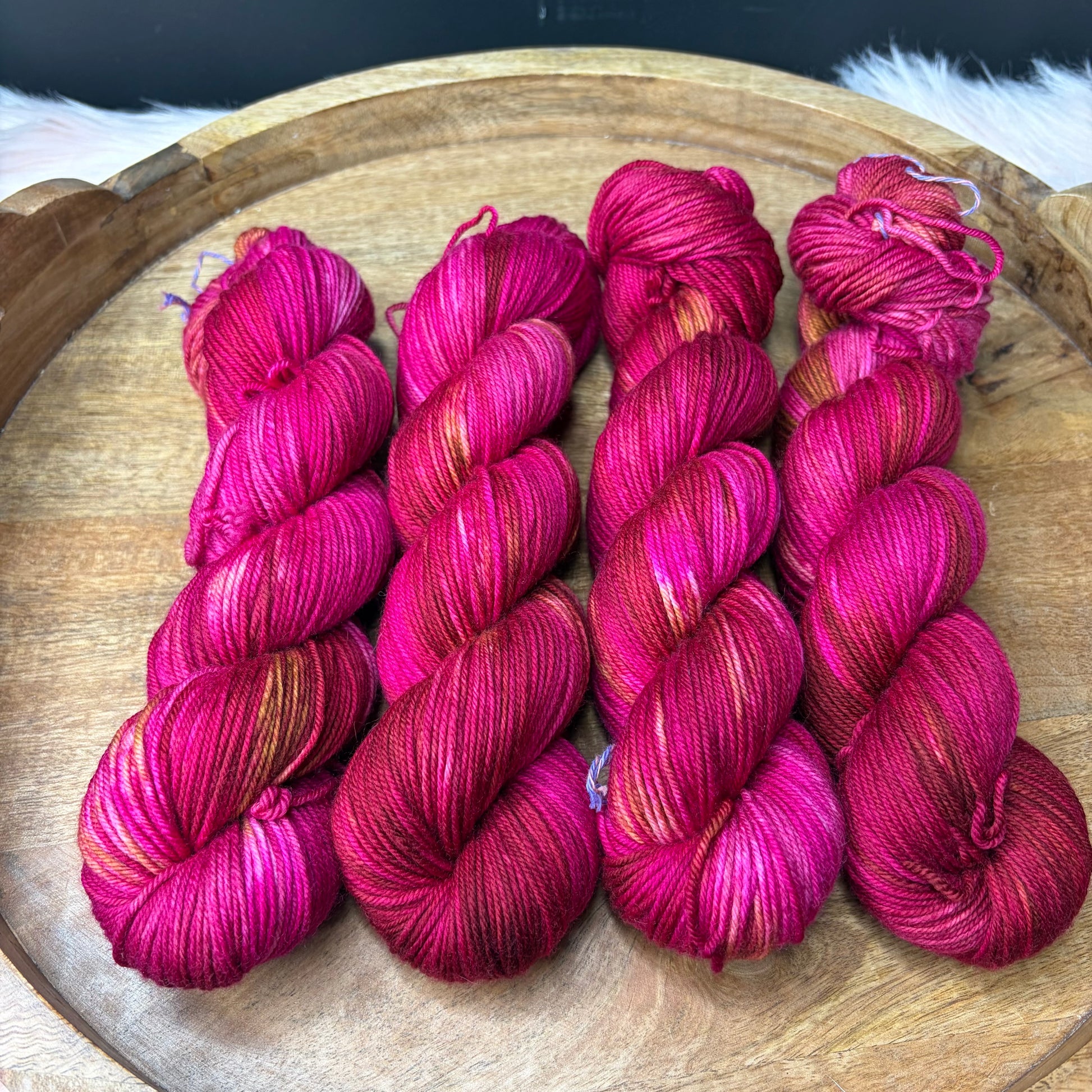Trevor Morgan DK: Named after Rachel Trevor Morgan who is famous for making hats for Queen Elizabeth. This is my absolute favorite base. I use it for EVERYTHING, socks, shawls, hats, cowls, sweaters you name it. It has a 4 ply construction and is round, bouncing and smooth and has great stitch definition.